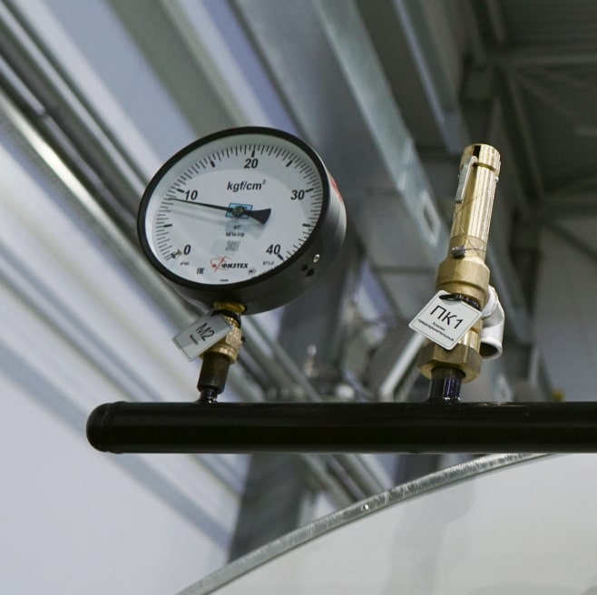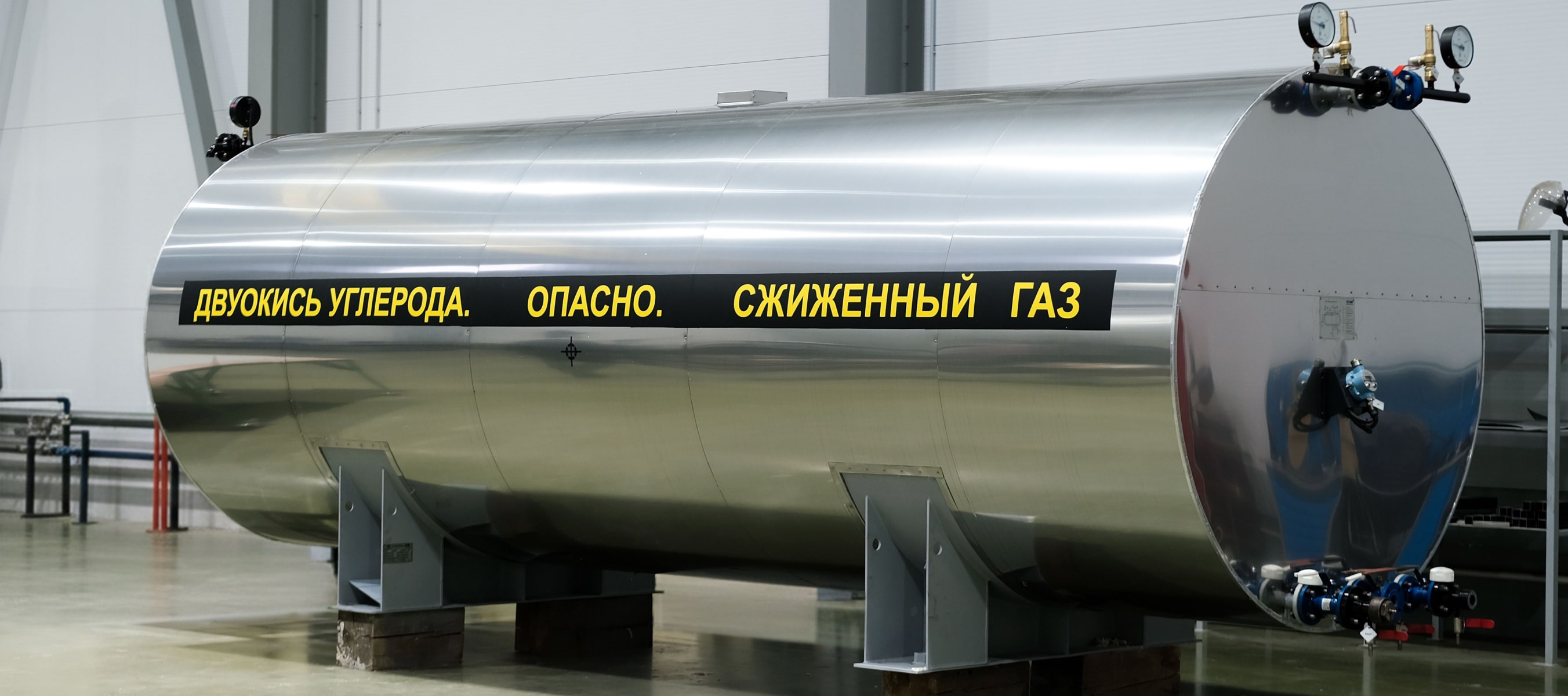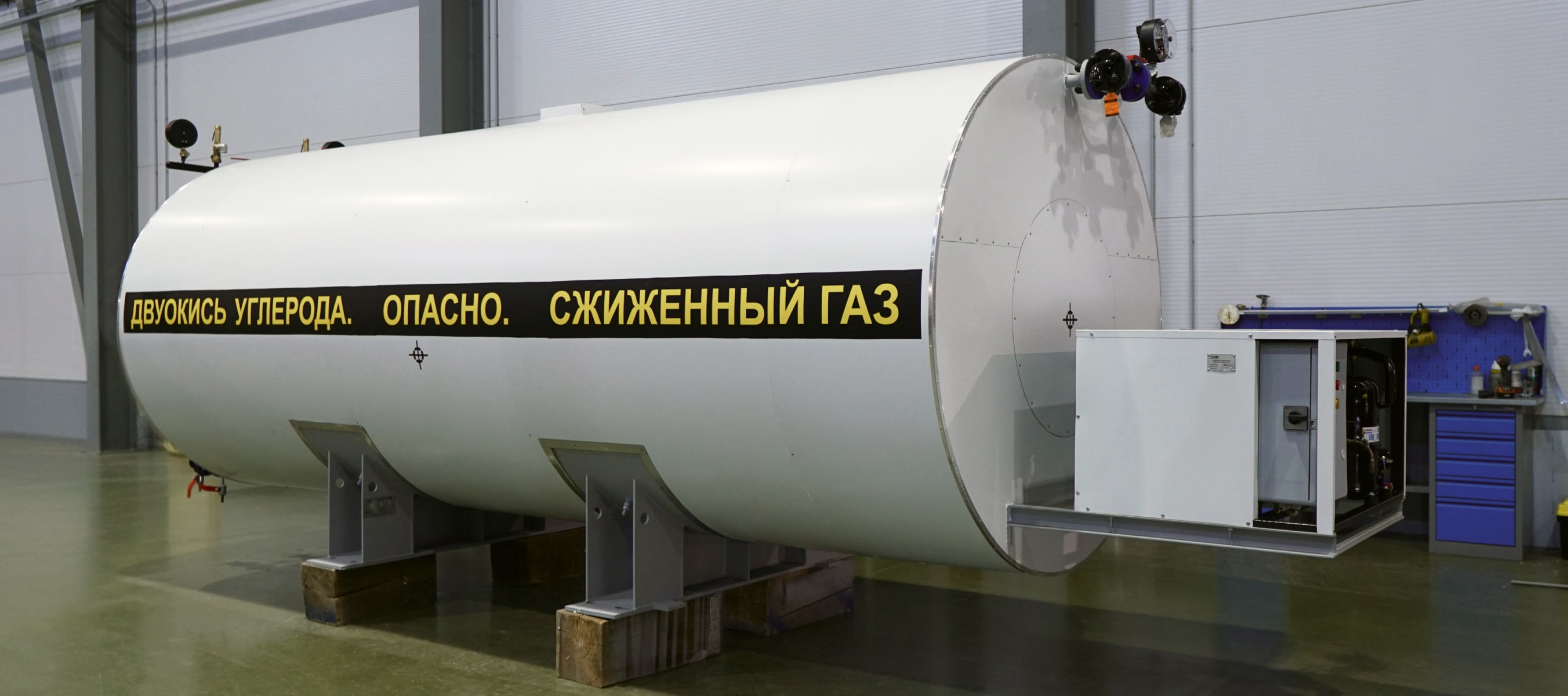 Резервуар может быть оснащен устройством поддержания давления (холодильным агрегатом), чтобы обеспечить неограниченный срок хранения жидкой двуокиси углерода.