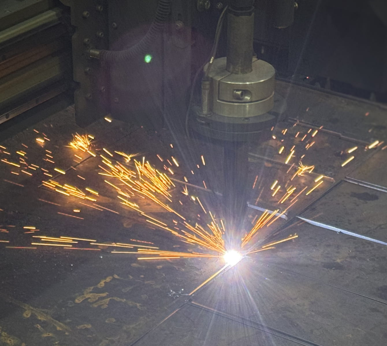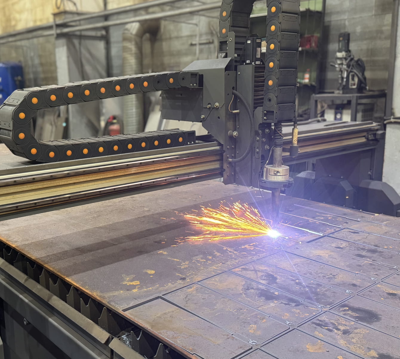 Наше производство оснащено современной установкой плазменной резки с источником Hyperterm, обеспечивающую быстрый и аккуратный раскрой листового металла, выполнение сложных контуров и фигур любой формы.