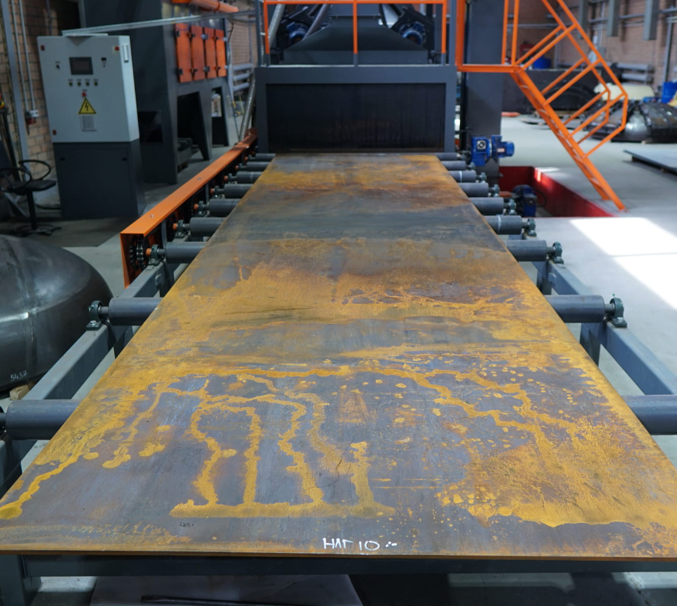 Оказываем услуги по очистке поверхностей листового металлопроката, фасонных и профильных металлических заготовок от окалины, ржавчины, старого покрытия и других загрязнений на дробеметной установке.
